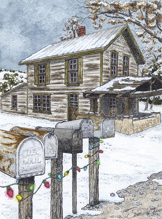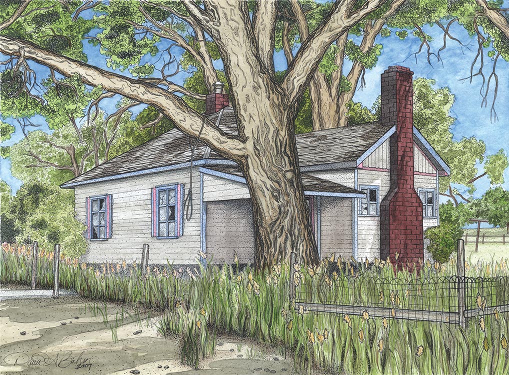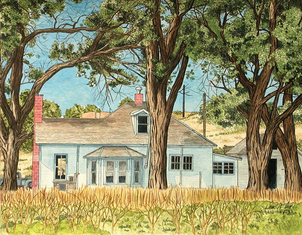 2007, ink & watercolor, 14" x 11" plus mat, glass and frame, $350. This is a different view of "Parker Farmhouse." In the 20s and 30s this house was part of the Lewis Dairy Farm, which delivered milk daily to Denver, about 30 miles away. Supposedly, the house was to be relocated and restored, but ended up being demolished (along with all outbuildings and trees) in 2016.