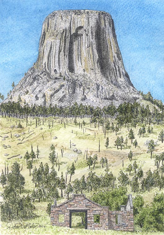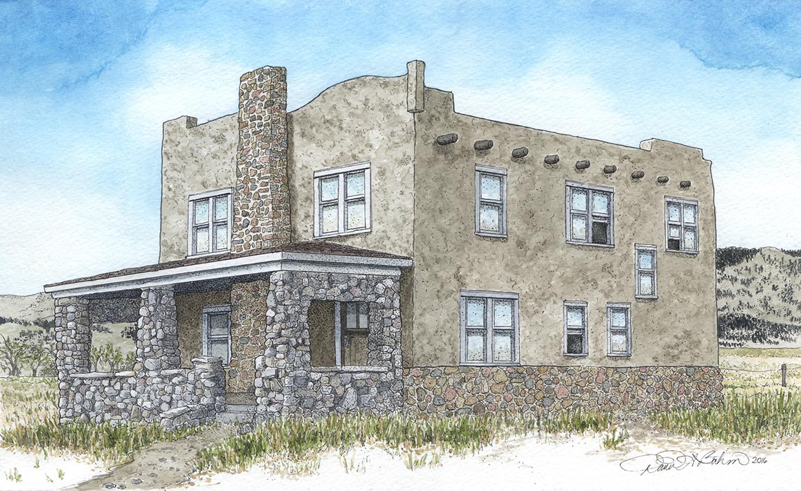 2016, ink and watercolor, 13" x 8" - wedding gift for my niece. This house was built in 1928 and is located in Park County, Colorado along Hwy. 285. The Pueblo Revival style, common in New Mexico, was extremely rare in Colorado at that time.