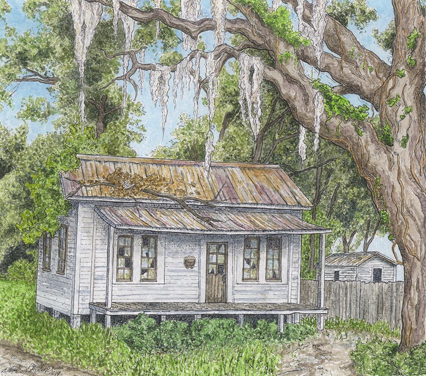2018, ink & watercolor, 7” x 10” plus mat, glass and frame, $285