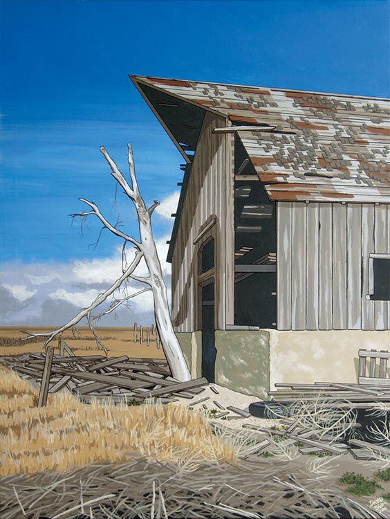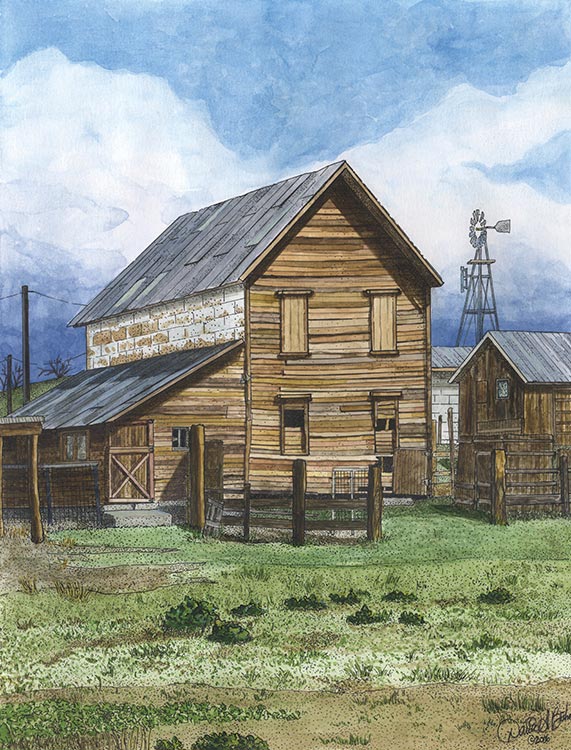 2006, ink & watercolor, 11" x 14" - sold. This barn was located near the southeast corner of Parker and Stroh Roads in Douglas County, Colorado. It was once a house, and its “twin” was moved seven miles north many years ago, where it still sits today as a house. Unfortunately, this barn was demolished in 2018.