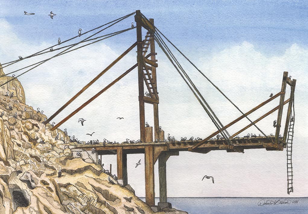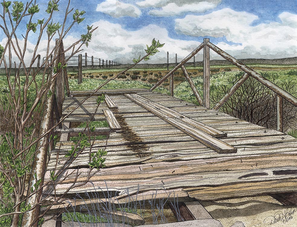 2004, ink & watercolor, 14" x 11" - sold. This is an abandoned bridge about a half mile north of my former neighborhood. Jennifer and I discovered it by accident in 2002. Upon taking more photos in 2006, Jen discovered a basement and house foundation at the top of the hill in the background (note the small washhouse by the poles). This bridge once served as an entry to the property the house stood on.