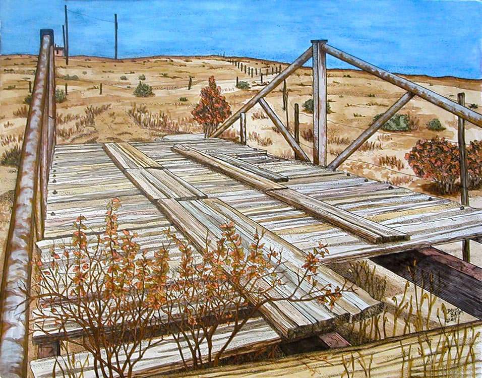 2006, ink & watercolor, 14" x 11" - sold. This is another version of the old bridge near my former neighborhood. This view is from the north side of the bridge looking south. Winner of the "Purchase Award" at the Celebration of Art show in Parker, Colorado. The Town of Parker bought the piece to add to their permanent art collection.