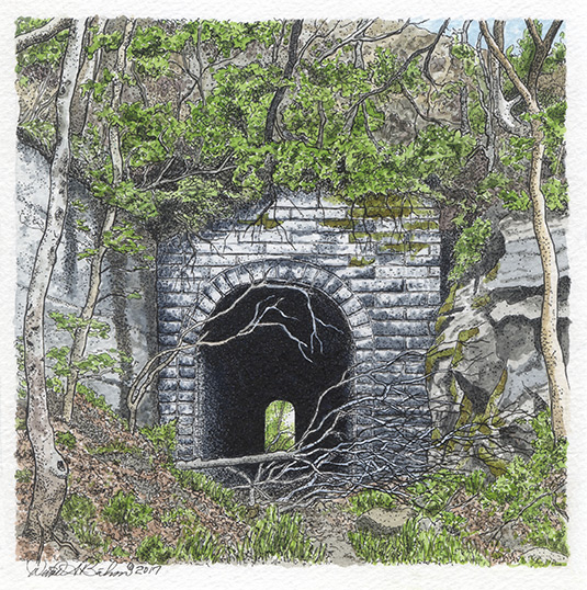 2017, ink & watercolor, 7" x 7" plus mat, glass and frame, $225. The western portal of tunnel #3 of the old Parkersburg, West Virginia branch of the B&O Railroad, abandoned in 1963. It retains its original 14' 2" clearance. The B&O Railroad decided to bypass the tunnel rather than increase its clearance an additional three feet. At 282 feet in length, it was known as the Trough and Long Run Tunnel.