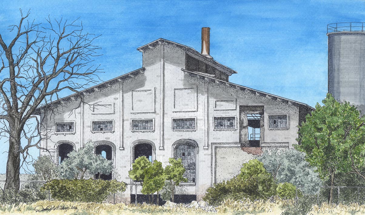 2012, ink & watercolor, 12" x 7" - sold. This is an old power plant west of Walsenburg, Colorado that produced electricity for the mines and town from the 1890s until 1972.