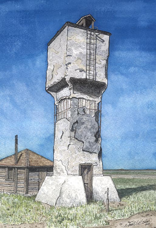 2010, ink & watercolor, 7" x 10" plus mat, glass and frame, $250. This old water tower was located a few miles east of Scott City, Kansas. Unfortunately the tower, farm house and barn were razed sometime in 2012.